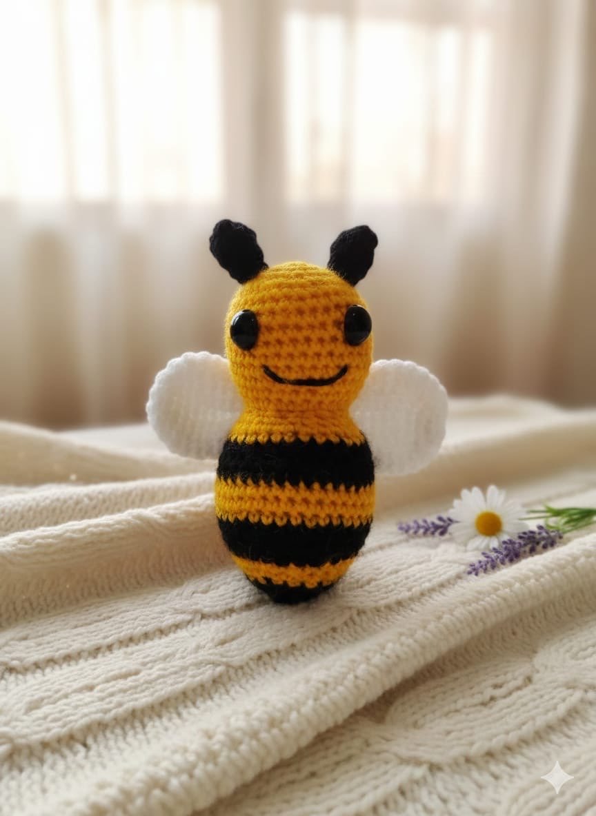 This crochet bee plush is a handcrafted amigurumi toy designed with a soft, rounded shape and simple stitched details. Featuring classic black-and-yellow striping, small antennae, and white wings, it offers a charming decorative or keepsake piece.