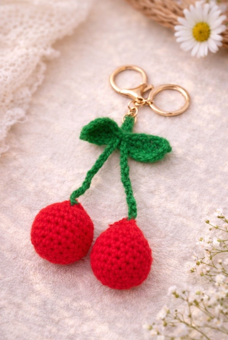 This crochet cherry keychain is a handcrafted amigurumi charm designed for use with keys or as a decorative key accessory. It features two carefully crocheted cherry shapes with textured green leaves, finished with a durable metal keyring and clasp.