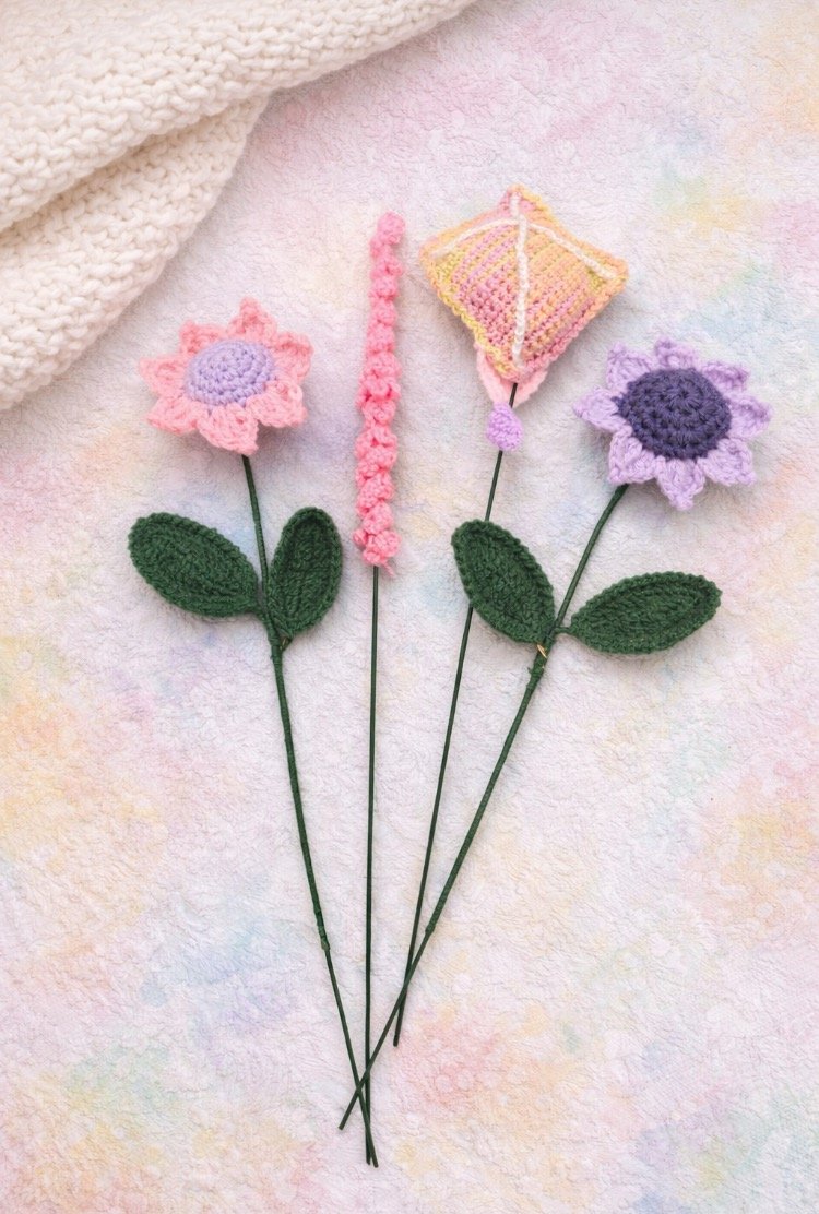 A handcrafted crochet flower featuring soft lavender petals with a contrasting deep purple center. The bloom is attached to a sturdy green stem with two textured crochet leaves, giving it a natural and balanced appearance.