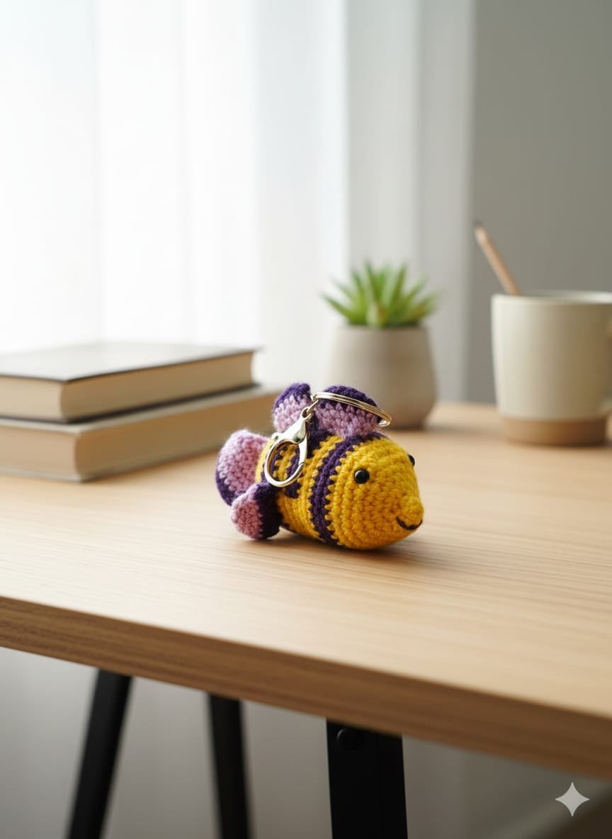 Crochet mini fish keychain crafted in vibrant yellow with contrasting purple accents. Designed in an amigurumi style, this compact accessory is lightweight and suitable for daily use.
