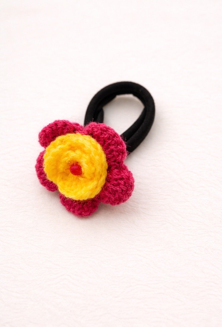 A handcrafted crochet flower hairband featuring a bright yellow center with rose pink outer petals. The layered floral design creates a soft, dimensional look, enhanced with a small bead detail at the center.