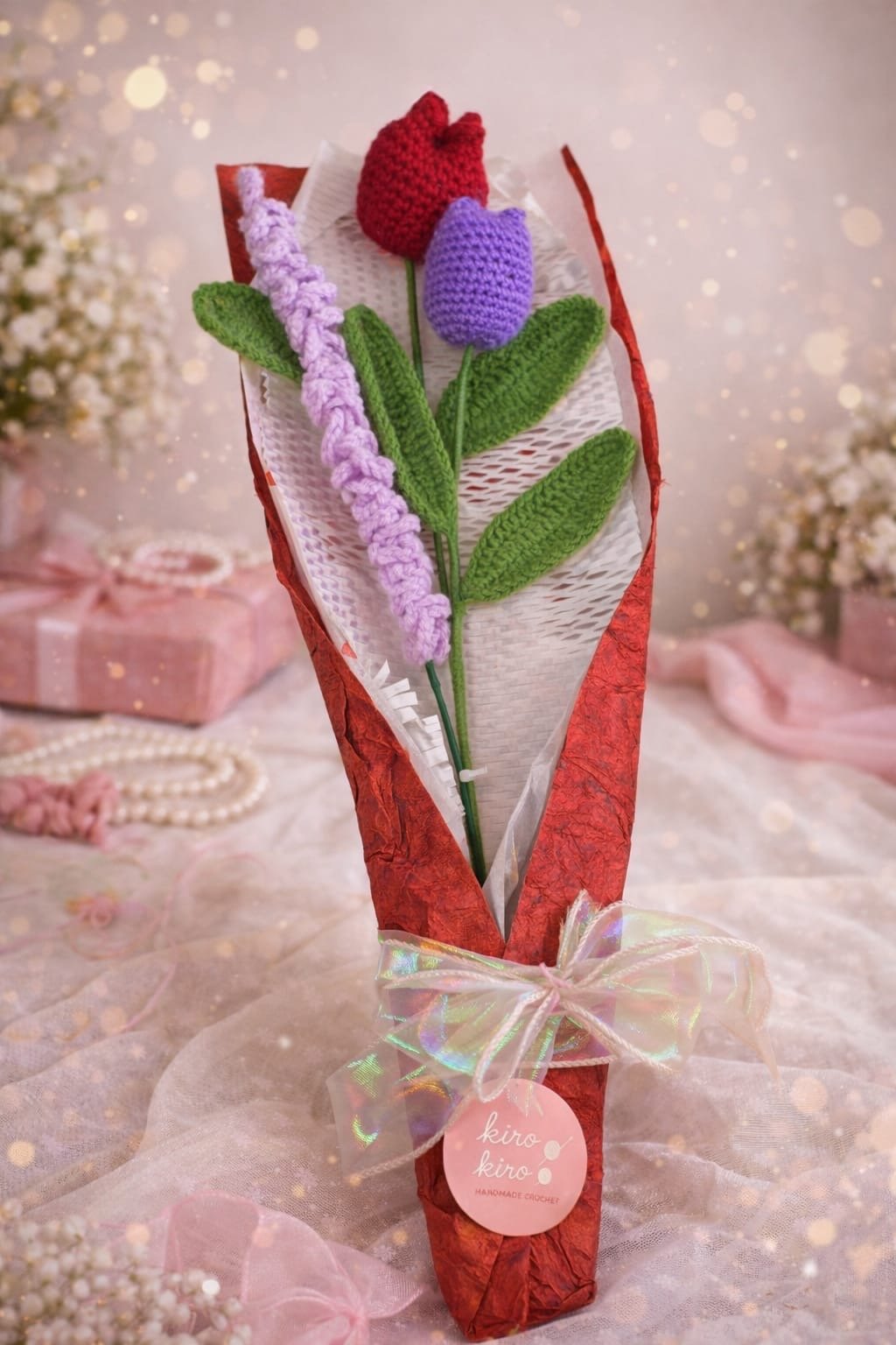 Handmade Crochet Mini Bouquet – 2 Tulips & 1 Lavender