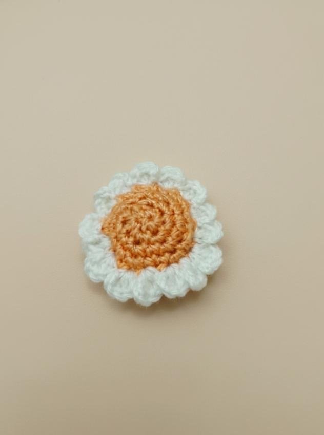 Handcrafted crochet sunflower hairband featuring a soft orange center surrounded by textured white petals. The floral design is securely attached to a matching elastic band, ensuring a comfortable and flexible fit.
