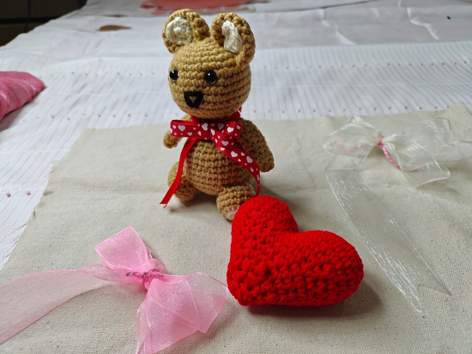 A handcrafted crochet teddy paired with a soft red crochet heart, designed as a thoughtful gifting option. The teddy features neatly stitched detailing, secure safety eyes, and a decorative red ribbon bow for a refined finish.
