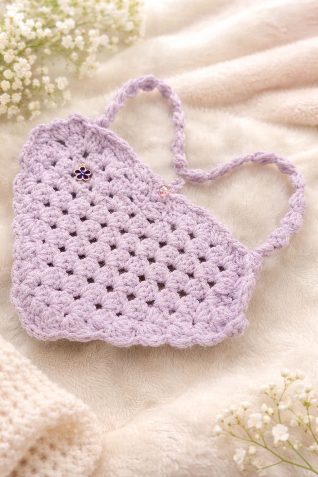 Lilac heart crochet Mini Bag – Handmade Crochet Pouch with Strap.